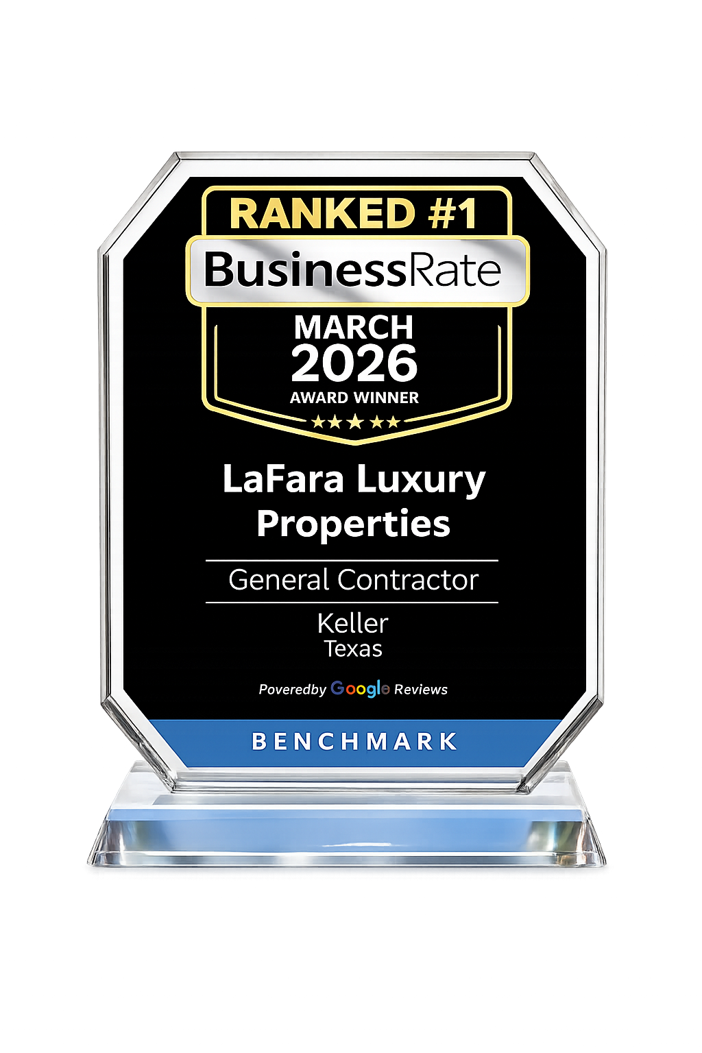 LaFara Luxury Properties was recognized as the #1 General Contractor for the month of March in the Dallas–Fort Worth area — a testament to our commitment to quality, communication, and client satisfaction on every project.Award Winner